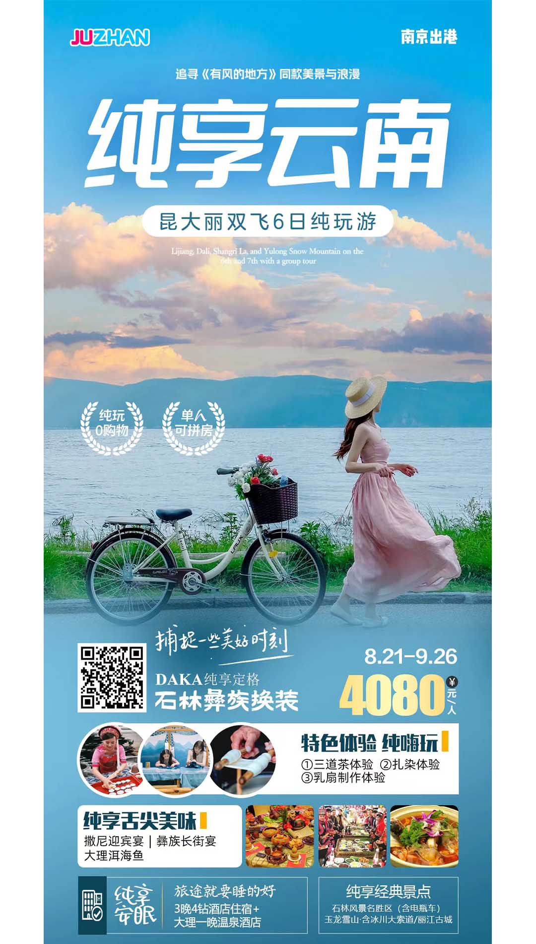 后在院子里?體驗扎染,大理扎染全靠手工制作,經(jīng)過手工繪圖、扎縫、染漂、扎花、碾平等工序制而成。顏料采用對人體有益的純植物——板藍根為原料,真正的保留了純樸和完全的手工制作。我們將為您提供一塊40*40cm扎染布,跟隨著非遺文化傳承人“老金花阿姨”,親手體驗一下,還可以把成品帶回家送給愛人。后?體驗乳扇制作,云南十八怪中有“牛奶烤著吃”指的就是乳扇烤好再放上玫瑰蜜,香味濃郁。 乳扇到底是怎樣制作的呢這趟旅行將給你一次乳扇的制作全過程體驗。之后前往?大理古城(游玩約120分鐘),位于風(fēng)光秀麗的蒼山腳下,是古代南詔國和大理國的都城,每一塊斑駁的墻磚和石板上,都深藏著訴不盡的故事與傳說,此地的生活節(jié)奏很慢,陽光明媚,溫度也十分適宜,在古城里逛逛小店,看看古建筑,聽聽白族歌手唱歌,非常愜意。 結(jié)束后前往?地?zé)釃?,地?zé)釃菍⑸衿娴臏厝B(yǎng)生文化、云南的白民族文化融合在獨特的自然風(fēng)光之中,整個景區(qū)體現(xiàn)了人與自然、天人合一的旅游環(huán)境,為此,被評為“中國最佳溫泉度假勝地”,是云南旅游昆明、大理、麗江、香格里拉黃金旅游線上的一顆明珠。享受?溫泉之夜,在水氣蒸騰氤氳中,一泡為快。隨著現(xiàn)場放出動感華麗的電子音樂,一場活力四射的?溫泉電音趴點燃了大理的夜空。跟隨著節(jié)奏投身音浪中,舞動身體、釋放激情,微涼的春夜,燥熱的氛圍,讓積攢已久的壓力瞬間消失無蹤!熱衷養(yǎng)生和喜歡派對的游客都能在溫泉玩嗨!