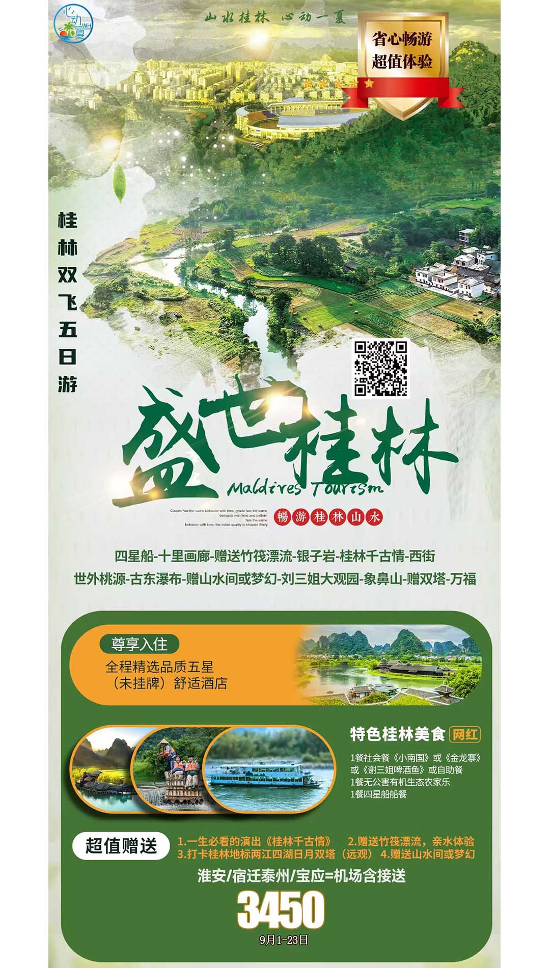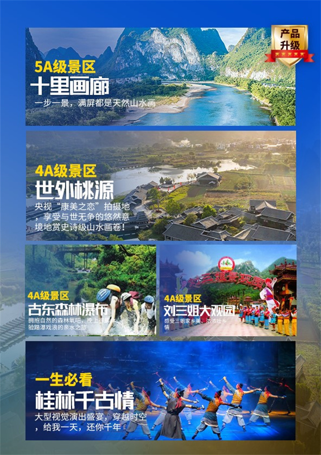 甄選行程溫馨提示:1、行程中列舉的時間為參考時間,具體出發(fā)/抵達(dá)時間以當(dāng)?shù)貙嶋H情況為準(zhǔn),如遇到堵車,景區(qū)排隊,漓江水位大小等特殊情況,游覽順序以及游覽時間根據(jù)當(dāng)?shù)厍闆r適當(dāng)安排。不再另行通知,敬請諒解!??!