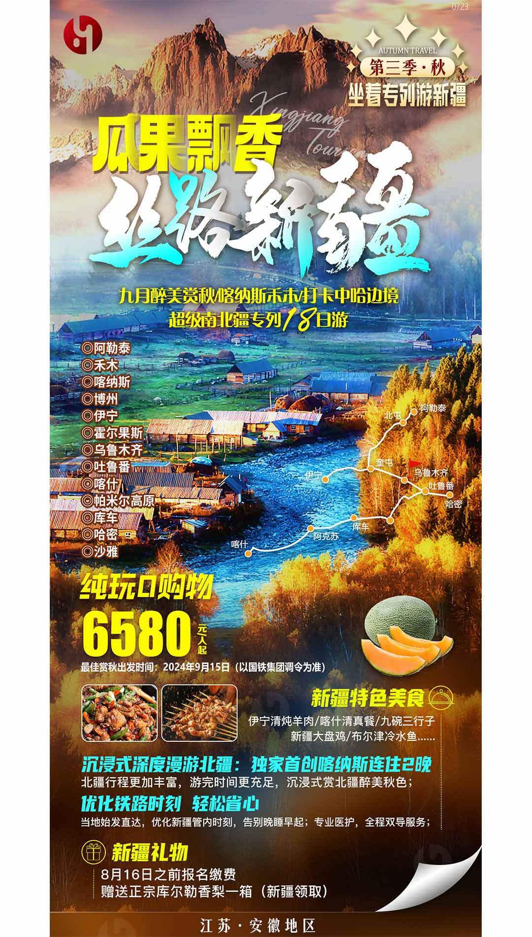 哈密(回王府、大海道魔鬼城、十二木卡姆)/烏魯木齊(天山天池、大巴扎)/吐魯番(坎兒井、火焰山、葡萄莊園、維族家訪)/阿勒泰(海上魔鬼城、喀納斯、禾木、五彩灘)/博爾塔拉(賽里木湖)/伊寧(霍爾果斯口岸、那拉提草原)/庫車(天山神秘大峽谷)/沙雅(雁沙洲胡楊林、七彩田園)/喀什(白沙湖、喀拉庫勒湖、艾提尕爾清真寺、香妃園、喀什古城)南北疆空調(diào)旅游專列18日游