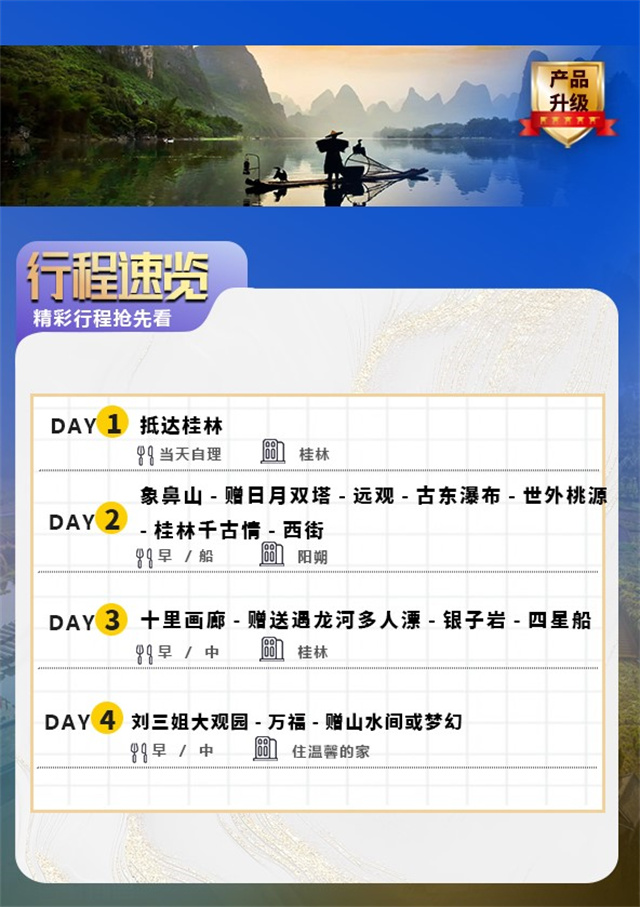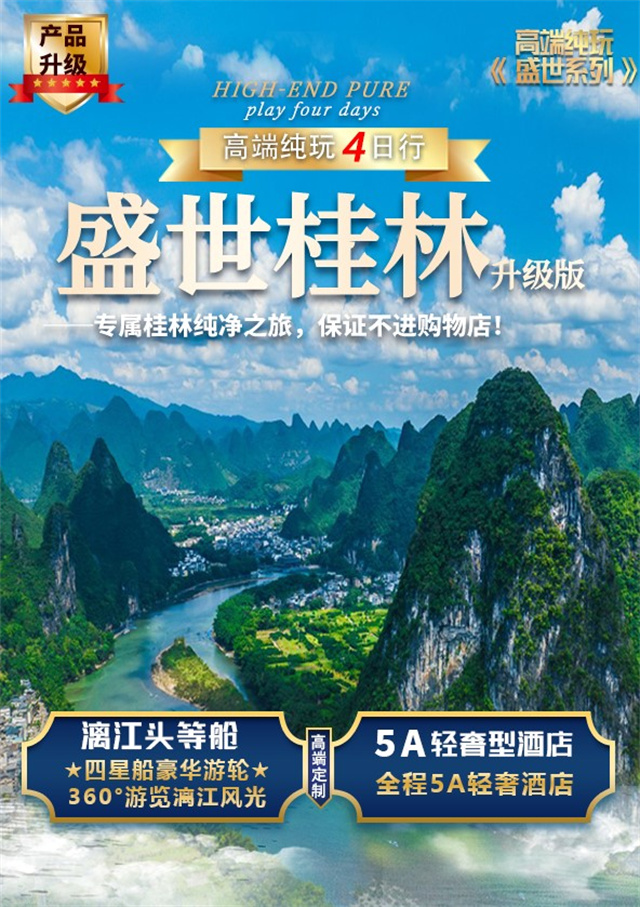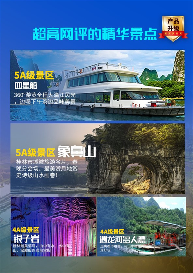 甄選行程溫馨提示:1、行程中列舉的時間為參考時間,具體出發(fā)/抵達(dá)時間以當(dāng)?shù)貙嶋H情況為準(zhǔn),如遇到堵車,景區(qū)排隊,漓江水位大小等特殊情況,游覽順序以及游覽時間根據(jù)當(dāng)?shù)厍闆r適當(dāng)安排。不再另行通知,敬請諒解!??!