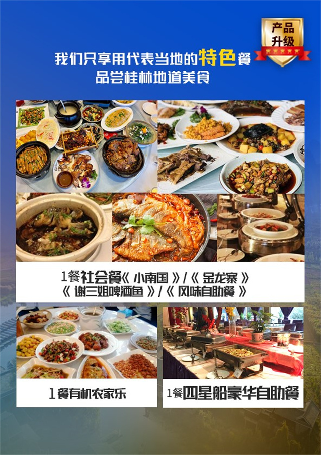 備注:桂林為國家三線以下旅游城市,酒店各項標(biāo)準(zhǔn)偏低,主要以衛(wèi)生舒適為主,提前做好心理準(zhǔn)備哦!如客人對上述參考酒店安排不滿意,處理方案如下:1、按實收價格退給客人自行訂房,2、可自補當(dāng)時差價升級客人滿意的更高標(biāo)準(zhǔn)酒店!3如若遇以上酒店無房情況下,可安排同等酒店,如我社拿到比計劃酒店檔次更高且價格等同的情況下,可以給客人免費升級!